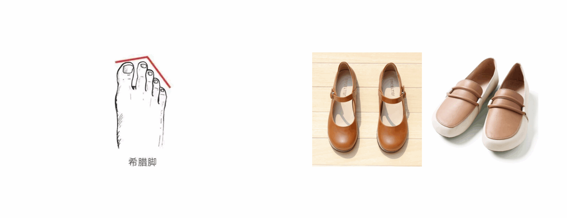 希腊脚型的人第二脚趾最长,传说中,希腊脚型最适合的鞋款就是圆头鞋或者斜方鞋。