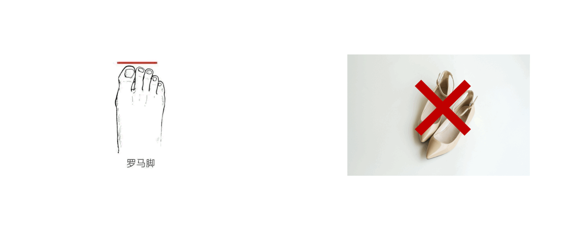 希腊脚型的人第二脚趾最长,传说中,适合罗马脚的鞋型,除了尖头鞋不合适以外,其他如圆头、斜方鞋都非常合适。